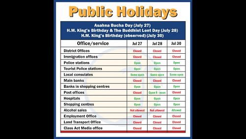 The auspicious Buddhist holidays Asarnha Bucha Day and Khao Phansa (Buddhist Lent), also called “Vassa”, will be observed next Friday and Saturday (July 27-28), respectively.