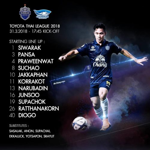 Buriram then made a second change with Sasalak replacing the largely ineffective Korrakot. The game was held up in the 80th minute when Pansa accidentally clashed heads with a Chonburi forward. He received running repairs and was able to continue after having the wound bandaged up.