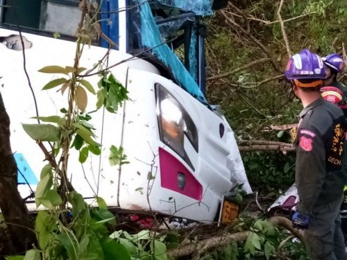 Bus driver Thian Naksawat, 57, was taken to the Ngow police station for questioning as he was suspected of falling asleep behind the wheel and causing the accident.