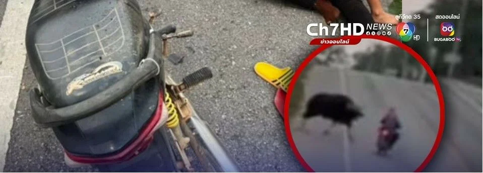 Yesterday, a wild bull from Khao Phaeng Ma caused injuries to a mother and her seven-year-old daughter as they were riding a motorcycle in Nakhon Ratchasima. The bull unexpectedly charged at them, colliding with their motorcycle. The mother fell to the ground, while the daughter’s clothing became entangled in the bull’s horns before she also fell, approximately 100 meters from the motorcycle. Both sustained serious injuries.