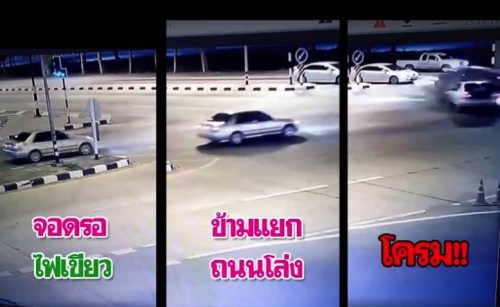 CCTV footage from Nakorn Ratchasima showed why drivers need to be careful when going through a green light – especially at deserted intersections at night.